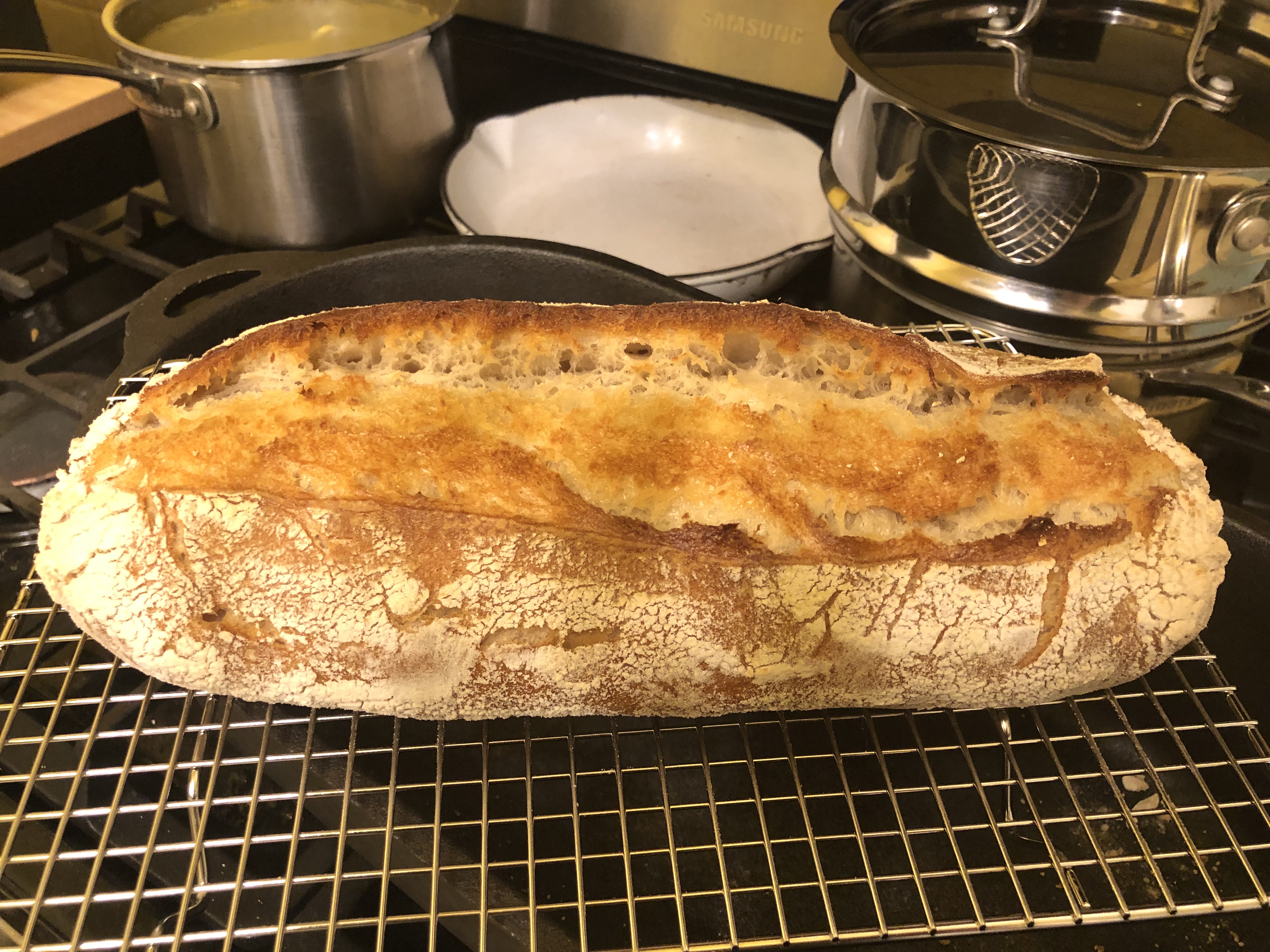 Well that loaf from this morning tastes pretty good but I think it needed more cooking time. I put it in dutch oven at 500 F for 20 mins then removed cover and dropped temp to 400 F for 15…